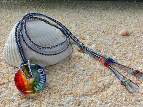 海を愛する多くの方に愛され続けるブランドの処女作です。サーフィンを楽しむ様に自分達が作るアクセサリーも楽しいものにしたい!そんな思いから見ているだけでHAPPYな気分にしてくれる『虹色=レインボー』のガラスヘッドに、キーワードとストラップカラーを組み合わせて〈楽しく選べるネックレス〉をデザインしました。下の層にマットホワイトのガラスを使用する事で、どんな色の洋服に合わせてもレインボーが綺麗に発色してくれます。 『No Rain, No Rainbow(雨が降らなければ虹はできない)』=『困難に思える事の後には素晴らしい事がまっている」 ハワイでは、虹にまつわるそんな素敵なことわざがあります。 海やハワイにまつわるキーワード+デザイナー自身が好きなキーワード=12個と9色のストラップカラーを組み合わせてあなた好みにカスタマイズしてくださいネ!