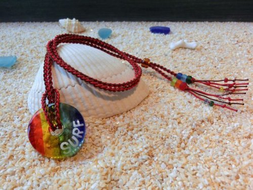 海を愛する多くの方に愛され続けるブランドの処女作です。サーフィンを楽しむ様に自分達が作るアクセサリーも楽しいものにしたい!そんな思いから見ているだけでHAPPYな気分にしてくれる『虹色=レインボー』のガラスヘッドに、キーワードとストラップカラーを組み合わせて〈楽しく選べるネックレス〉をデザインしました。下の層にマットホワイトのガラスを使用する事で、どんな色の洋服に合わせてもレインボーが綺麗に発色してくれます。 『No Rain, No Rainbow(雨が降らなければ虹はできない)』=『困難に思える事の後には素晴らしい事がまっている」 ハワイでは、虹にまつわるそんな素敵なことわざがあります。 海やハワイにまつわるキーワード+デザイナー自身が好きなキーワード=12個と9色のストラップカラーを組み合わせてあなた好みにカスタマイズしてくださいネ!